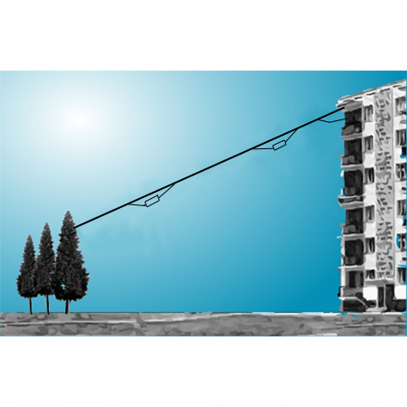 Теперь жители верхних этажей многоэтажек могут установить 8-диапазонную полноразмерную антенну, питаемую непосредственно фидером из окна или балкона с креплением только в одной точке. Вторая точка крепления может находиться на расстоянии около 85 метров на соседнем здании или дереве. Конструкция с усиленными несущими тросами обеспечивает устойчивость к обледенению и ураганным ветрам, а применение трансформаторов на длинных линиях (ТДЛ), фторопластовых кабелей и ферритовых сердечников большого сечения позволяет работать с мощностью до 1 кВт.